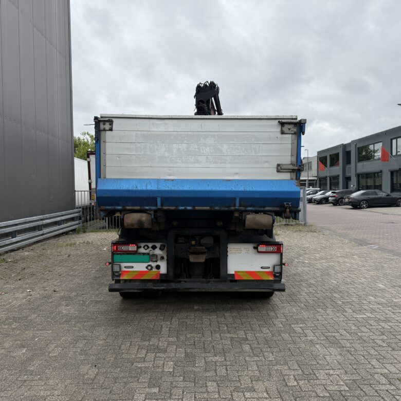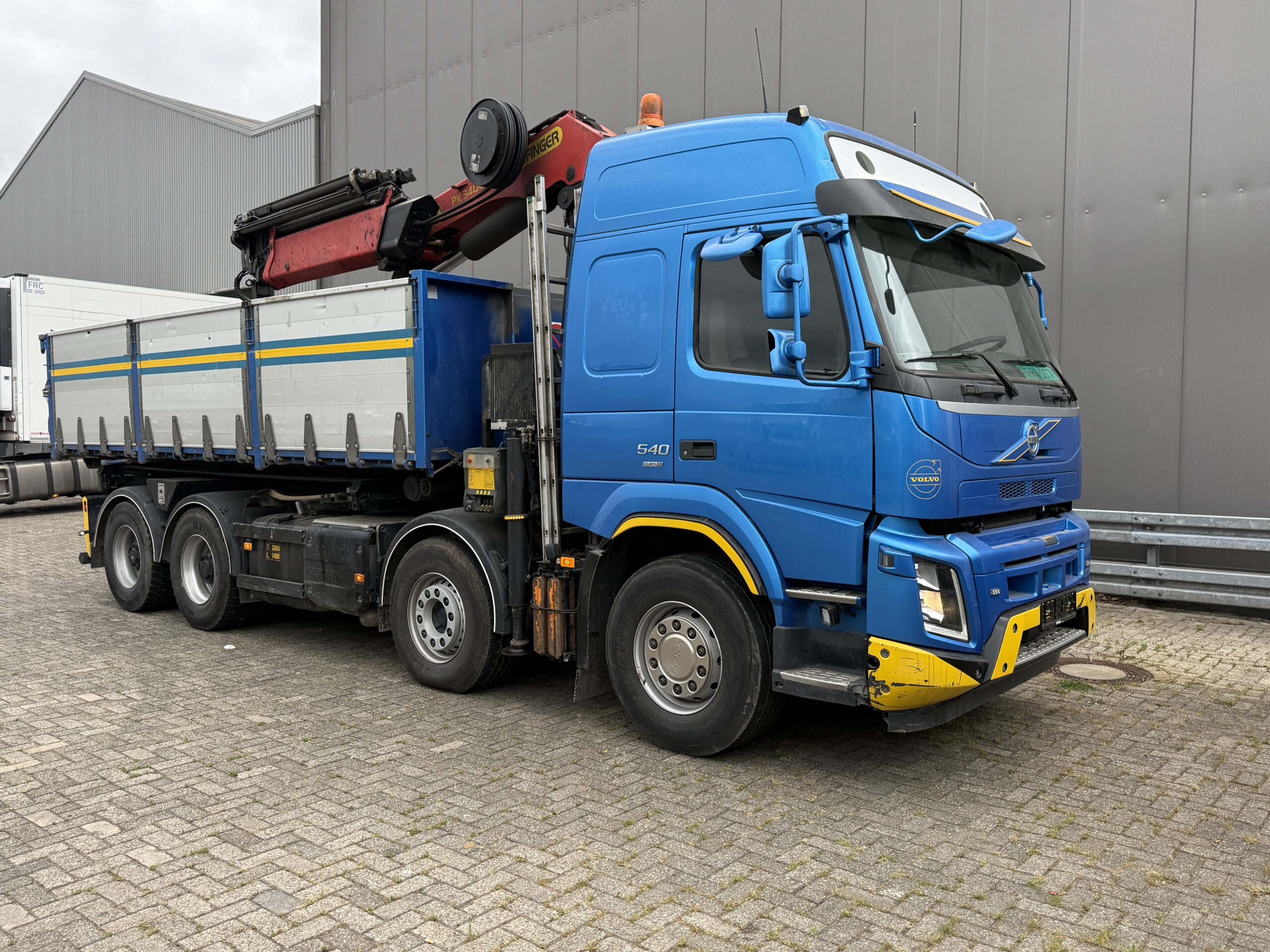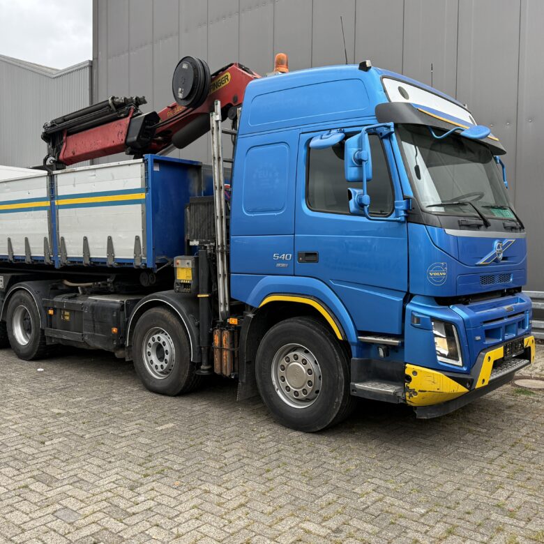 Volvo FMX540, Triple 8x4 crane truck 3-side cable-system/ tipper with Palfinger 34002 SHE, remote control. 590 mtr box tipper. 1-2 Axle 1955 mm 2-3 Axle 2055-4004 mm 3-4 Axle 1370 mm Palfinger PK34002 SHE 6x extendable, Remote control, rotator. 6,3 mtr. 4450kg. 8,2 mtr. 3250kg. 10,3 mtr. 2450kg. 12,4 mtr. 1960kg. 14,5 mtr. 1540kg. 16,7 mtr. 1420kg. 8x4, ABS, AD-BLUE, Aluminium bords, dubbele montage, Crane, Lift-Axle, Hub reduction, PTO, Coupling, Automatic lubrification, Sleeper cab, Air suspension, Euro 6, Airco, Rear camera.